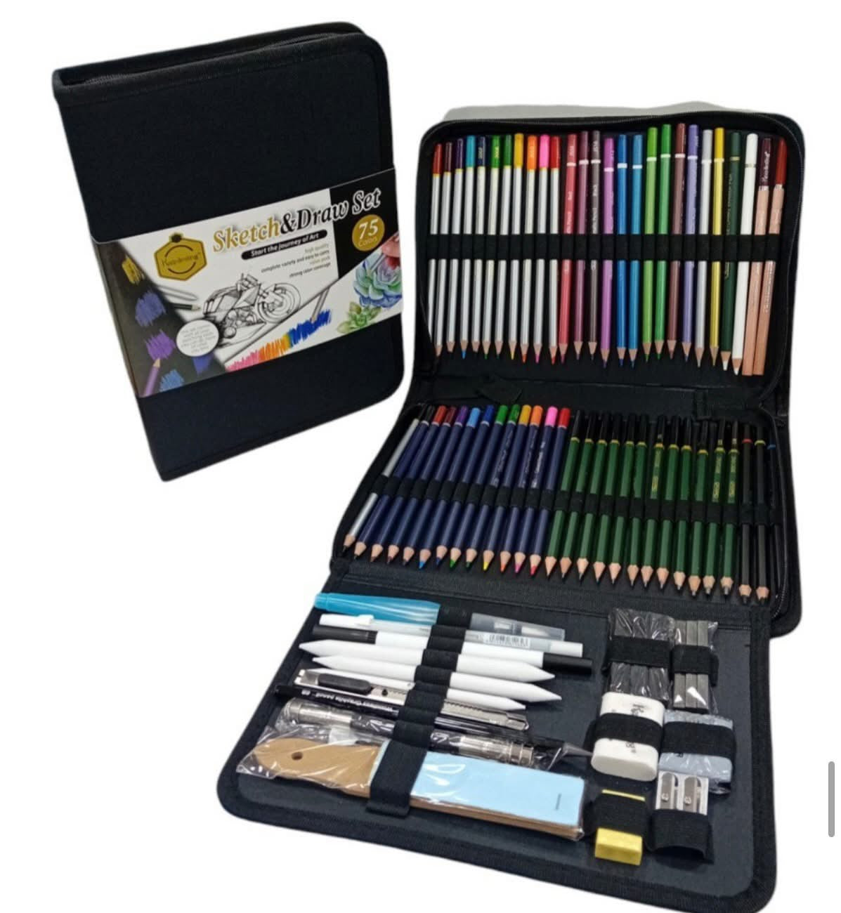 مجموعة أدوات الرسم والتلوين الاحترافية تتكون من 75 قطعة شاملة شاملة. مجموعة ألوان، أقلام رسم بدرجات متعددة، أدوات مدمجة وتظليل، محايات، مبراة، وفرشاة، جميعها مع حقيبة أنيقة ومنظمة. هذه المجموعة للفنانين المبتدئين والمحترفين لتجربة تخفيضات مختلفة بسهولة