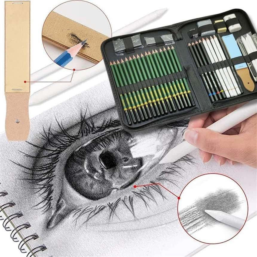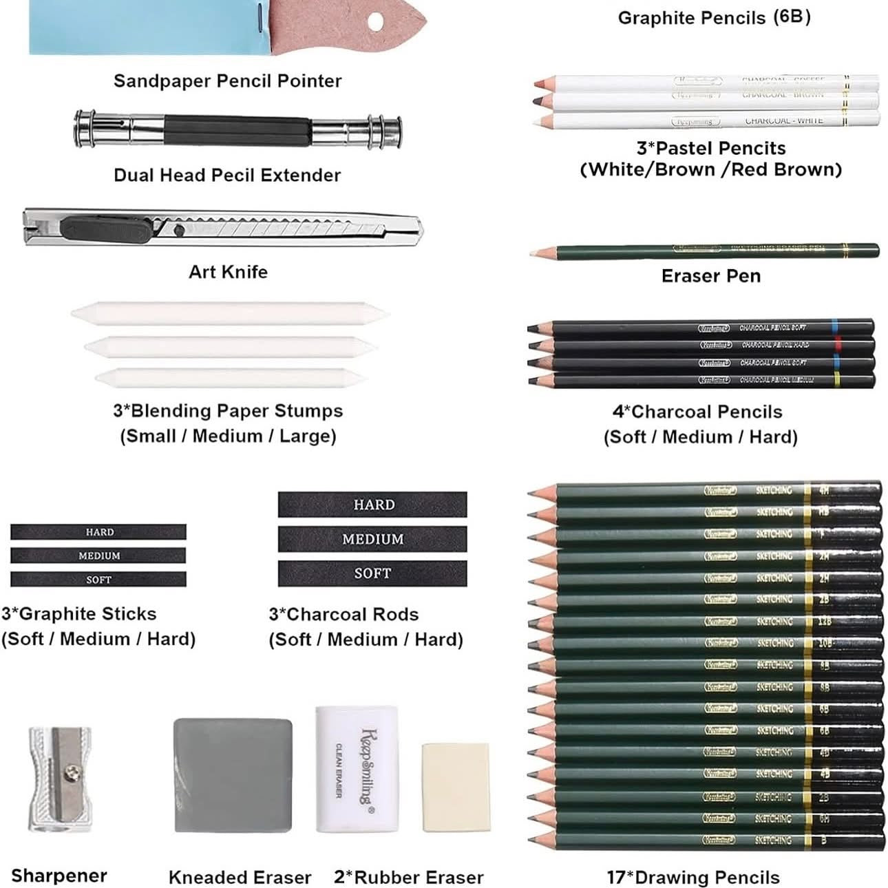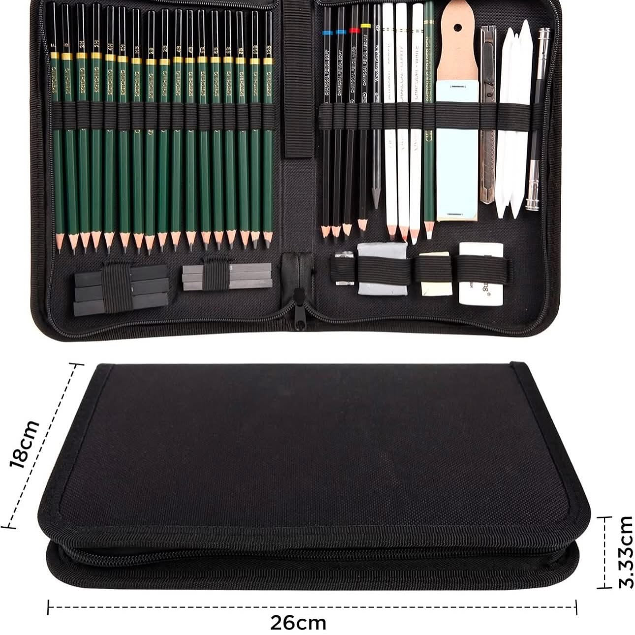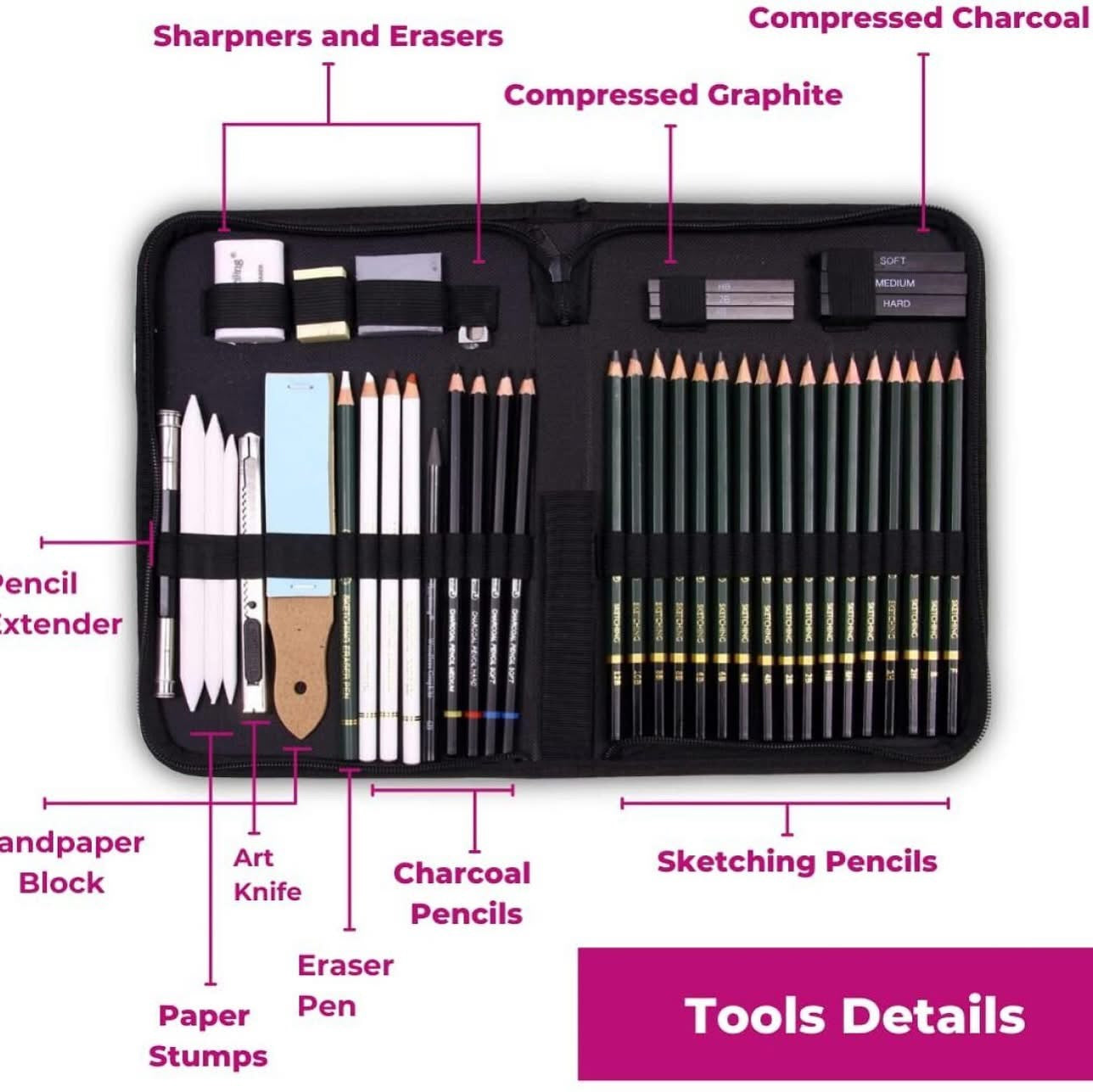 5- 4 قلم رصاص فحم، 3 قلم رصاص ممحاة، 1 قلم ممحاة، 1 ممحاة فحم معجن و 2 ممحاة مطاطية، 1 قالب 6- ورق صنفرة، 1 مبراة، 1 موسع قلم، 1 سكين فني و1 شنته قماشيه فاخره .